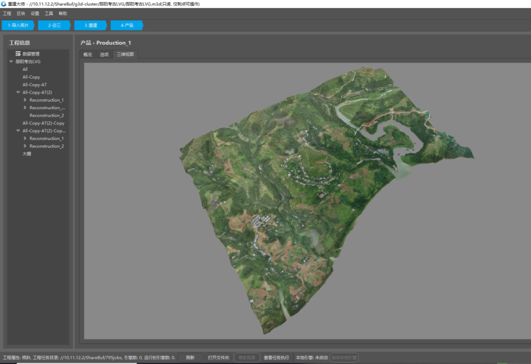 研究团队在武汉大学测绘遥感信息工程国家重点实验室对在遗址现场获取的倾斜测量数据进行了处理与分析。所用软件主要是武汉大势智慧科技有限公司开发的重建大师V4.0。重建大师支持倾斜摄影、补拍照片和移动式激光点云等多种数据导入融合,进行三维模型重建。它集成了G-Engine的鲁棒性空三模块、高效重建、AI智能处理等核心算法,拥有人工智能加持,具有空三稳定、建模效率高、模型质量优等特点。